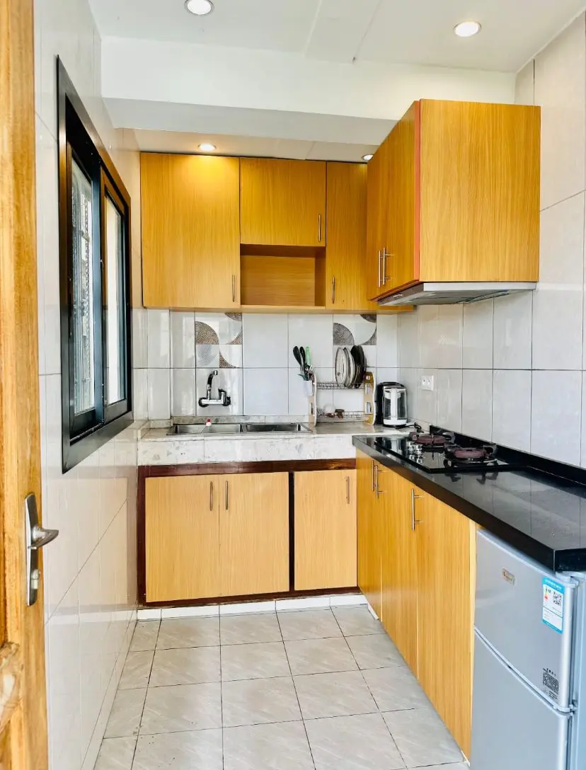 - Cuisine américaine bien équipée (micro-onde, plaque, vaisselle, frigo)